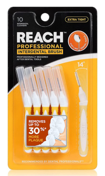 chieve a deep clean with REACH Interdental Brush Extra Tight. Its soft, flexible bristles remove plaque from tight spaces and dental work. The ergonomic handle offers comfort, ensuring easy access to hard-to-reach areas for a bright, healthy smile.